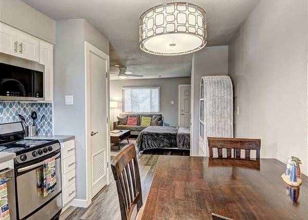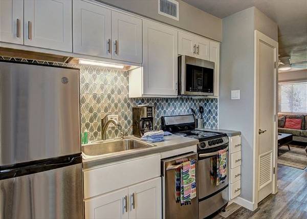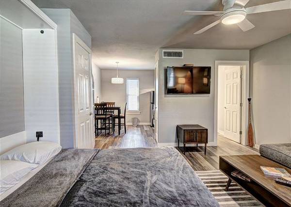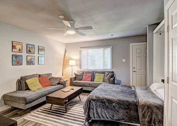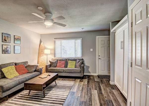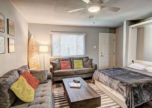 Remodeled, corner unit is easily accessible on the bottom floor and is fully furnished with a new queen bed, Spectrum Cable, Smart TV (sign on with your Netflix, Hulu, etc), Wi-fi, and full mini-kitchen.