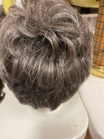 3 Lady's wigs FOR ALL 3 1) chestnut brown - long shag ( worn 2 times) 2) with short shag salt/ pepper colors w/ wispy sides and bangs 3) dark brown Curley text